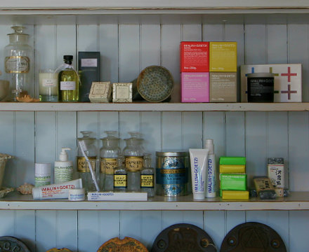(Malin + Goetz) face and hair products put them on the map, but it’s the cult favorites like their dark rum candle ($52.00), which throws a scent so well that one can get a brilliant waft of it from rooms away, and their sulfur-based acne product, which have become such hits they’ve had to limit how many people buy at a time. The next addition to the beauty moguls' line may be home-cleaning products or toothpaste, though this may be a few years down the road. As of this week, they open their fourth (Malin + Goetz) store on Madison and 90th. Regional (Malin + Goetz) products are easily available at J. Seitz in New Preston, Hudson Supermarket on Warren Street (shelf display above), and Splash Spa in Poughkeepsie. But their connection to the region they weekend in is real and present. Recently they shipped an antique haberdashery counter purchased at Hudson, NY’s Vincent Mulford antique store for their Los Angeles outlet in the ultra-hip section of Larchmont Village. "It wasn’t easy to get it there," Malin says. "But it was important to bring that local mix to our stores."