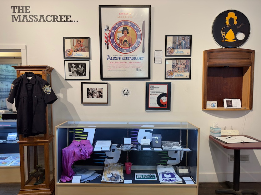 Certainly, there are artifacts that will give a charge to music fans – such as Arlo’s t-shirt and a bandmate’s ticket from the 1969 Woodstock festival. And anyone whose Thanksgiving would not be complete without listening to “Alice’s Restaurant Massacree” (and perhaps some of the extrapolatory re-recordings Arlo produced over the years) will be thrilled to see not only an officer’s uniform donated by the Stockbridge Police Department, but also one of the 8x10 glossy pictures of the actual garbage Arlo and his pal tossed to the bottom of the 15-foot cliff. It’s in black and white and not color, some of you might be disappointed to find out.