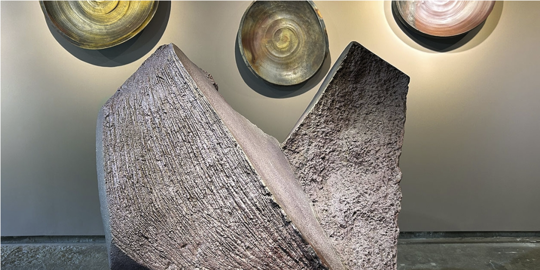 In the Garage Gallery, “Sculpture – Tablets – Chargers” presents a survey of recent ceramic works by Paul Chaleff, a pioneering sculptor credited with reviving the appeal of wood-fired ceramics in the US. Chaleff’s gestural tablets and vessels—fired in massive “dragon kilns” modeled after Japanese anagama traditions—evoke Neolithic pottery as well as the modernist legacy of artists like Isamu Noguchi and Anthony Caro. “For him, clay is like nature itself,” says Brezgunova.