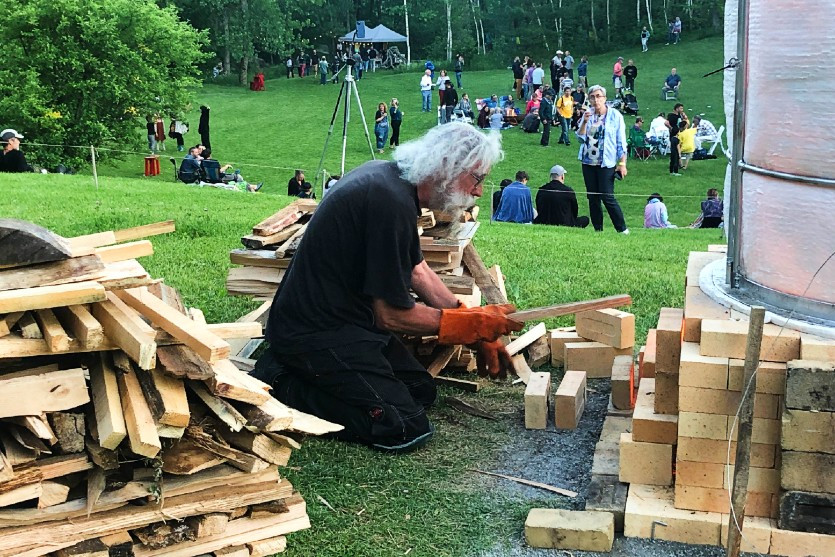 A day-long celebration of art and nature, the well-attended second annual TurnPark Art Space Summer Festival in West Stockbridge on June 11, had some elements (as in fire) that made it a highly memorable event for the crowd. The theme was “Healing Flames,” centered around the unveiling of “Earth and Sky,” a an eight-foot sculpture by world-renowned, Estonian-American (and locally based) ceramicist Sergei Isupov. For two weeks, Isupov, who was educated in Ukraine, had been building an eight-foot ceramic sculpture, working with renowned kiln builder Andres Allik from Estonia.