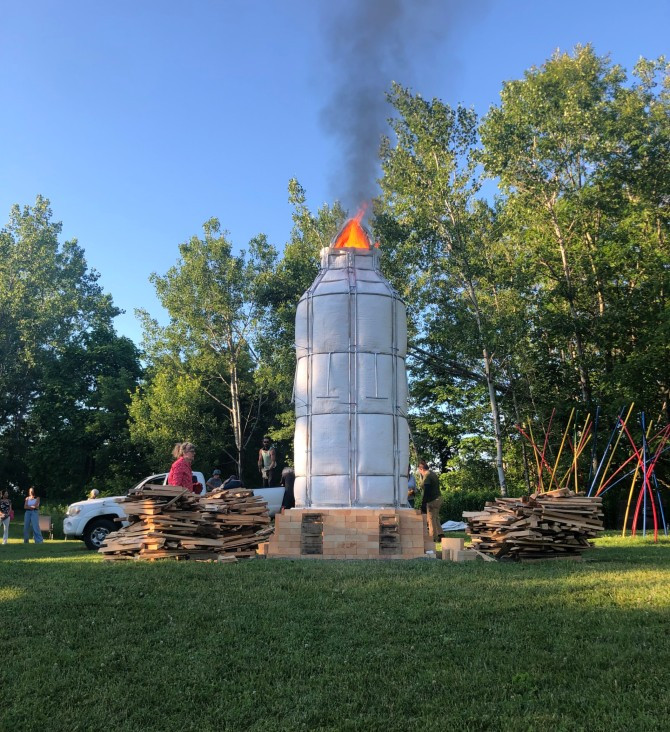 In the morning, the 10-foot-tall “petal” kiln was fired and was stoked all day by volunteers as it built to a peak temperature of 2300°F. At the close of the festival, Allik deemed the sculpture ready for its unveiling, and the kiln, with the assistance of the volunteers, opened like petals of a flower to reveal a fiery glowing “Earth and Sky.” This kiln is the first of its kind to be built and fired in New England, and will remain on site for future projects.