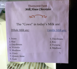 After my intense chocolate tasting, a plain glass of milk seemed in order. The farm sells its Whole Cream Line Milk right there, and it really is unlike any other milk I’ve ever had. When I met the cows earlier, Clint explained that the milk never goes through a pump; it’s expressed directly into individual ca.1920s pails, which allows the milk to remain whole. Then it's slowly pasteurized. And if he hadn’t told me that the cows are bred and fed for high-lactose milk, I would have thought there was sugar added to it. In the runup to Valentine’s Day, Milk House Chocolates is filled with special gift packages. A trip to the farm would be a delicious treat for you and your sweetheart (at any time of the year, actually). There’s nothing quite like meeting a cow and savoring her signature gift. To Karissma, Daydream, Victoria, Madison, Glory, Queen Anne, Kate and all the rest, I say "namaste." Milk House Chocolates at Thorncrest FarmOpen Thursday, Friday and Saturday, 10 a.m. – 5 p.m. 280 TownHill Road, Goshen, CT (860) 309-2545