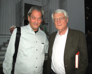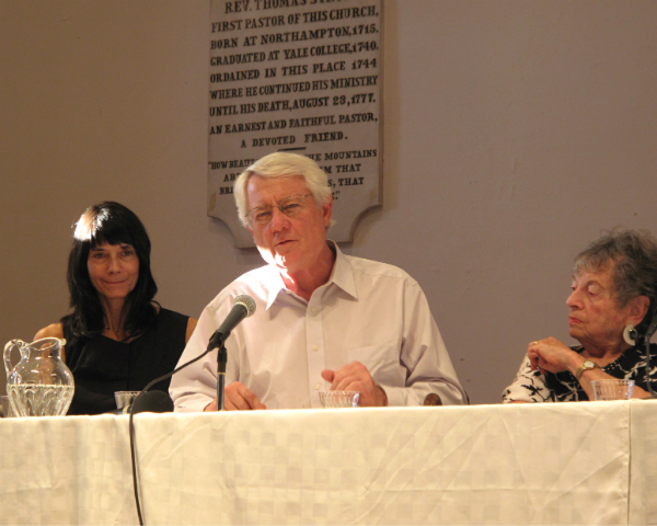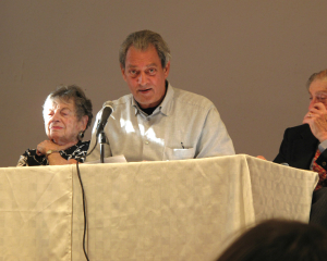 Amy Krzanik reports from New Marlborough. To celebrate the 20th anniversary of Music & More’s Award-Winning Authors series, host Mitchel Levitas invited back to the Meeting House the three authors who attended the inaugural Authors event in 1994. Paul Auster, Roy Blount, Jr. [both shown left] and Siri Hustvedt have only become more popular over the last twenty years, Hustvedt so popular, in fact, that she couldn’t attend the event due to a prior commitment abroad. Auster, her husband, spoke on her behalf, reading a prepared statement where she enlightened listeners to how her life has changed in the last twenty years, including her foray into the medical world, which in 1994 she claims she could have never imagined. Auster himself spoke of strange coincidences he’s had over the years due to his writing, echoing situations portrayed in many of his novels. Roy Blount, Jr. read the humorous tale of a fishing excursion taken years ago, and Gloria Levitas recounted being urged by her publisher to use a pseudonym when releasing her psychiatric work early on in her career, so as to pass as a male author. This touched nicely on both Hustvedt’s latest novel, The Blazing World, as well as the most recent film from Authors speaker Ellen Weissbrod, entitled a woman like that. Both the book and the film focus on the sexism women face in the art world, with Weissbrod’s documentary delving deep into 17th century Italy to investigate the life and work of painter Artemisia Gentileschi. This was Mitchel Levitas’ last year at the helm of the Authors series, and he was honored by The New Marlborough Village Association for his years of exceptional work.
