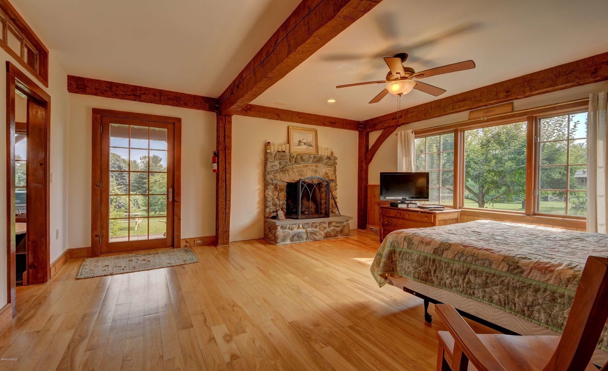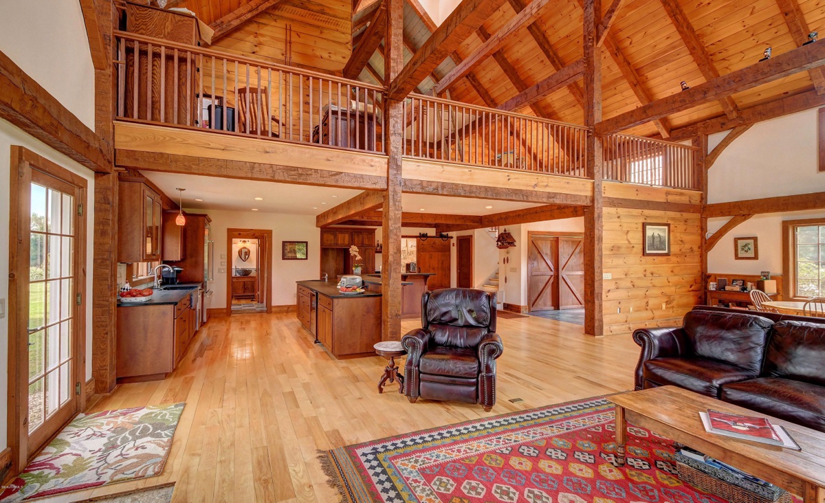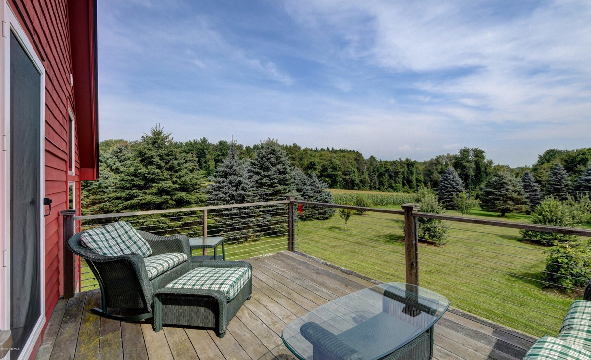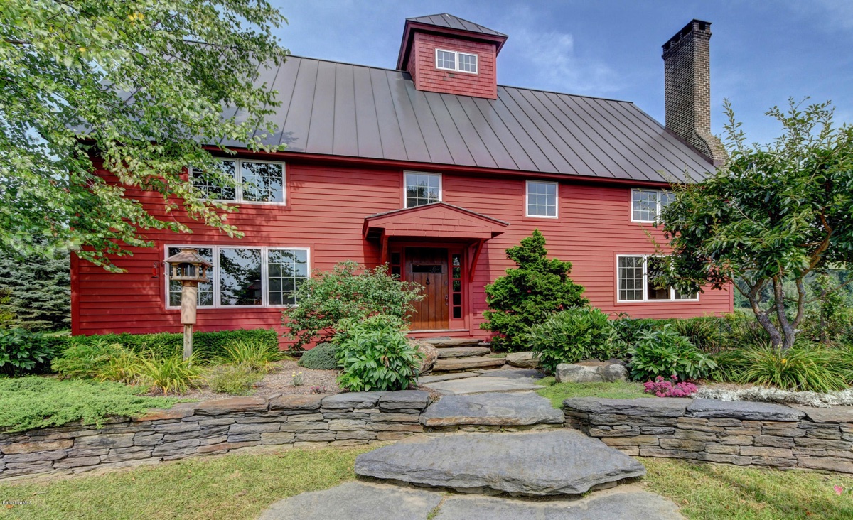 This classic post and beam barn-style home in South Egremont includes 3 bedrooms and 3 bathrooms. It features east and western views on five acres of land with stone walls, fireplaces, patios, an outdoor shower, an orchard of fruit trees with peaches, pears, apples and more. The separate barn can be used as a heated studio/living space. Listed at $1,375,000 by Berkshire Hathaway Homeservices Barnbook Realty.