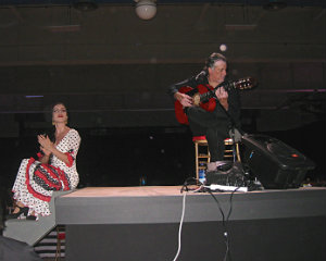 Artistic Director Julianne Boyd introduces the principal cast members: Jeff McCarthy (Cervantes/Don Quixote), Felicia Boswell (Aldonza/Dulcenea), Tom Alan Robbins (Sancho Panza) and Todd Horman (Padre); Flamenco artists set the scene at the reception.