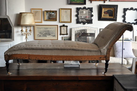Napoleon III chaise longe, recently reupholstered by an artisanal upholsterer with hemp, linen and horsehair (it will last another 100 years, Neiley says), $1,200.