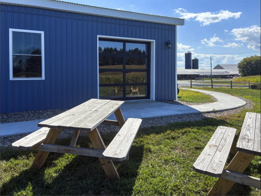 The exterior of the new Kinderhook taproom at Del’s Roadside, with outdoor seating and a glass garage door.