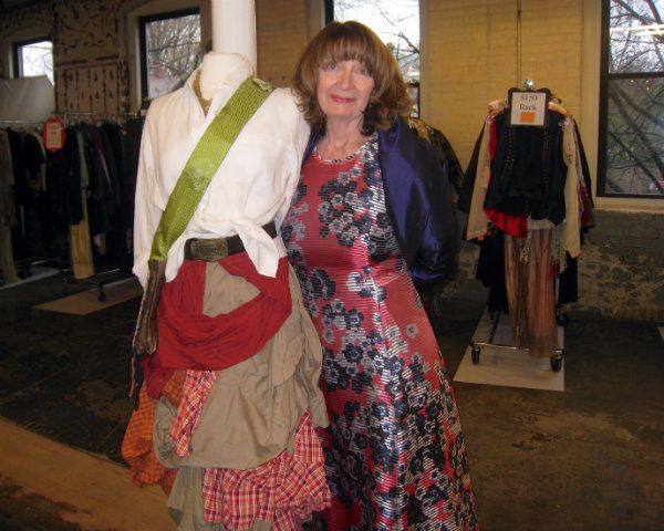 Fashionista Vicki Bonnington poses with a mannequin displaying a skirt made from men's shirts, created by one of her favorite designers, aimee g.