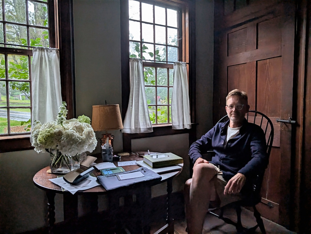 It’s the first August day to feel like fall. It’s 58 degrees, and pouring rain waters the moat of foliage around West’s paint-stripped 1750 Colonial in the southern Berkshires. He throws open the side door. Lacking steps at the moment, the entrance appears to be floating a couple feet off the ground. He offers me a hand up through a gauntlet of bowing hydrangeas into the parlor.