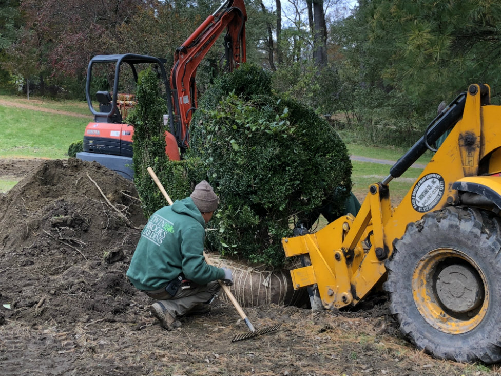The relocation process was handled just as lovingly. While trees are typically dug up by a tree spade with four big blades that slice through the soil and roots, conditions were so tight at the original site that the tree spade couldn’t get access. So these topiaries were hand dug, expanding the time the task would take from about 20 minutes to hours, in total a five-day process. Once uprooted, the topiaries were craned above the Days’ two-story house (all this during Hurricane Michael, Larkin added) and trucked nearly 100 miles to Stockbridge. The expert crew of 10 from Twin Brooks Gardens in Millbrook, New York worked another couple of days, carefully positioning the topiaries, cutting away the burlap covering the root balls, and adding the backfill.
