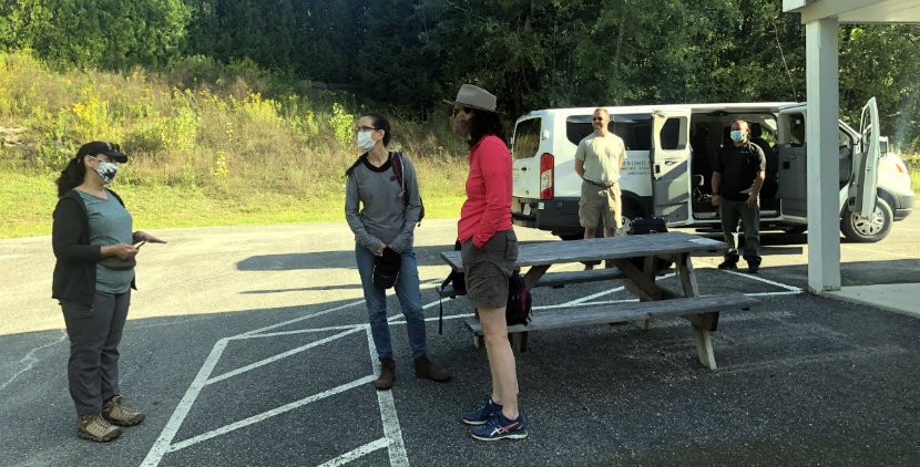 Housekeeiing rules were simple: You can remove your masks when walking, but keep your social distance. Put masks on when passing others on the trail. Watch for cars. And what I found most comforting: Miraglia gave us permission to go slower if we needed. Either she or Dave would be the sweep and no one would be left behind. She also encouraged us walk with intention and curiosity. Dave led us in a few warmup exercises and we were off.
