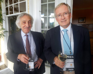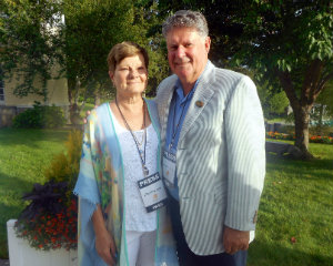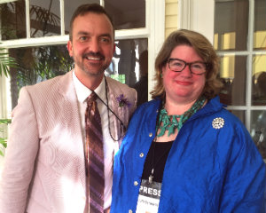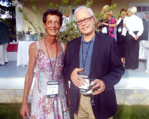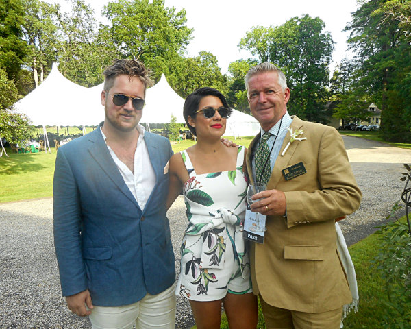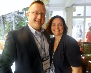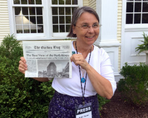 Lisa Green reports from Stockbridge. The Berkshire Botanical Gardens’ annual Fête Des Fleurs stepped it up this year with a sit-down dinner and a tribute to the new and improved local newspaper. To honor The Berkshire Eagle’s support of the area’s cultural institutions, The BBG asked those organizations to be part of the party on Friday, July 28 at the home of Chris and Ellen Greendale. Representatives of institutions such as The Mount, the Shaker Museum Mount Lebanon, the Clark Art Institute, Jacob’s Pillow Dance, and Barrington Stage Company as well as community-minded businesses including A.J. Schnopp, Jr. Construction Inc. and Main Street Hospitality were among the guests attending “The Best View of the Berkshires: Celebrating our New Eagle.” And while we must gently insist that Rural Intelligence offers an equally fine “view of the Berkshires,” the landscape vistas afforded by the Greendales’ property were quite spectacular. To complement the newspaper theme, guests were provided press passes as nametags, topiary eagles designed by Board Chair Matt Larkin hovered over the tables, and a “newspaper” program shared the latest BBG news. [Above, Executive Director Michael Beck at the reception, with Julia Schwartz.]