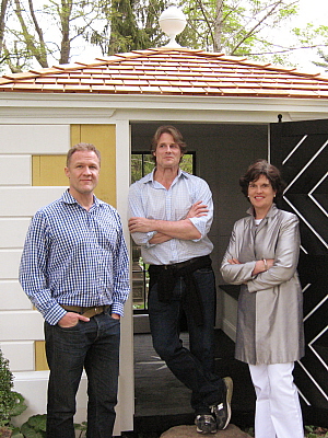 Dick Bories and James Shearron, designers of the "18th-century Privy" with Crisse MacFadyen; Michael Devine beside his "Garden Blogger's Retreat"