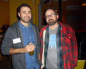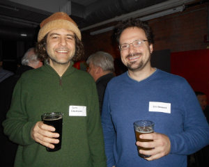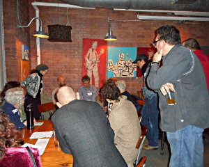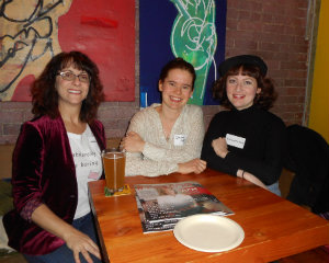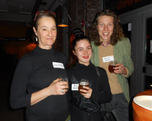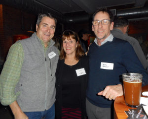 Lisa Green reports from North Adams. It almost felt like a behind-the-scenes Hollywood on the Housatonic at the Berkshire Film and Media Collaborative networking event on Wednesday, Nov. 29. There are a large number of film and media professionals in our part of the world, and a substantial group of them showed up at Bright Ideas Brewing in North Adams, Mass. to engage in trade talk and, of course, craft beer. Many of them were first-time attendees at a BFMC event, validating the collaborative’s assertion that there's a new momentum building in a growing local industry. “We want to keep more people in western Mass,” said executive director Diane Pearlman, and to that end, the organization creates educational, workforce and production opportunities for those in the film industry who want to live and work in the region. [Above, Board of Advisor members Joe Finnegan and John Whalan flank Diane Pearlman, executive director of the BFMC.]