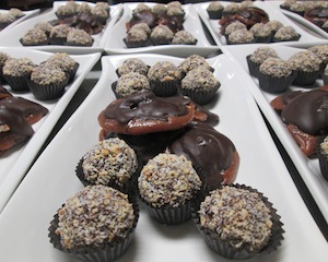 Chocolate truffles and turtles by H.R. Zeppelin Chocolates; Carey Beckwith and MS Walker Wines' Bruce Beckwith sip Chris Brooks' garlic and potato soup with maple-cured bacon.