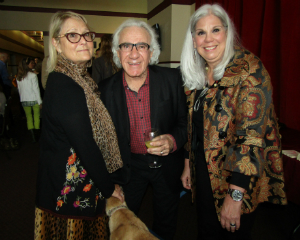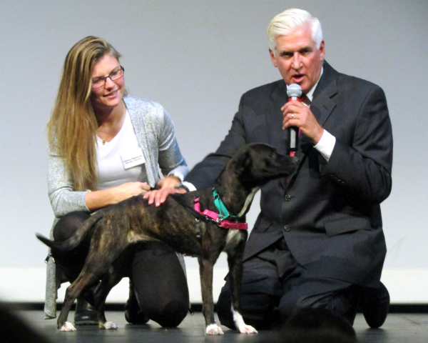 BHS executive director John Perreault with board president Cindy Bartlett and Marsha Weiner, co-founder of Catwalk; volunteer Sandy Haywood poses with Dakota, a dog she fostered and then adopted.