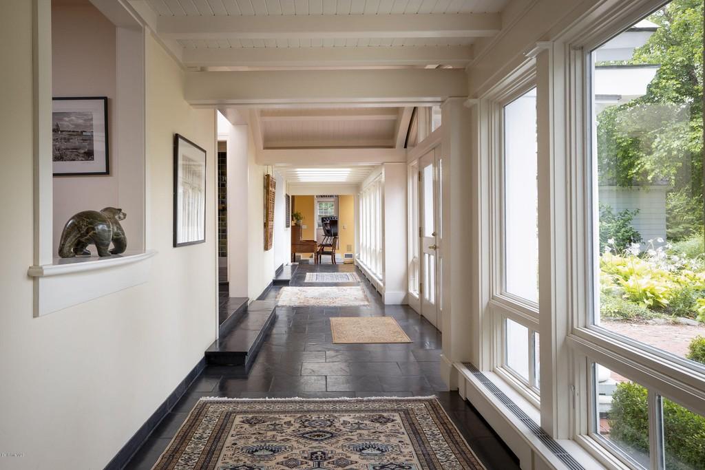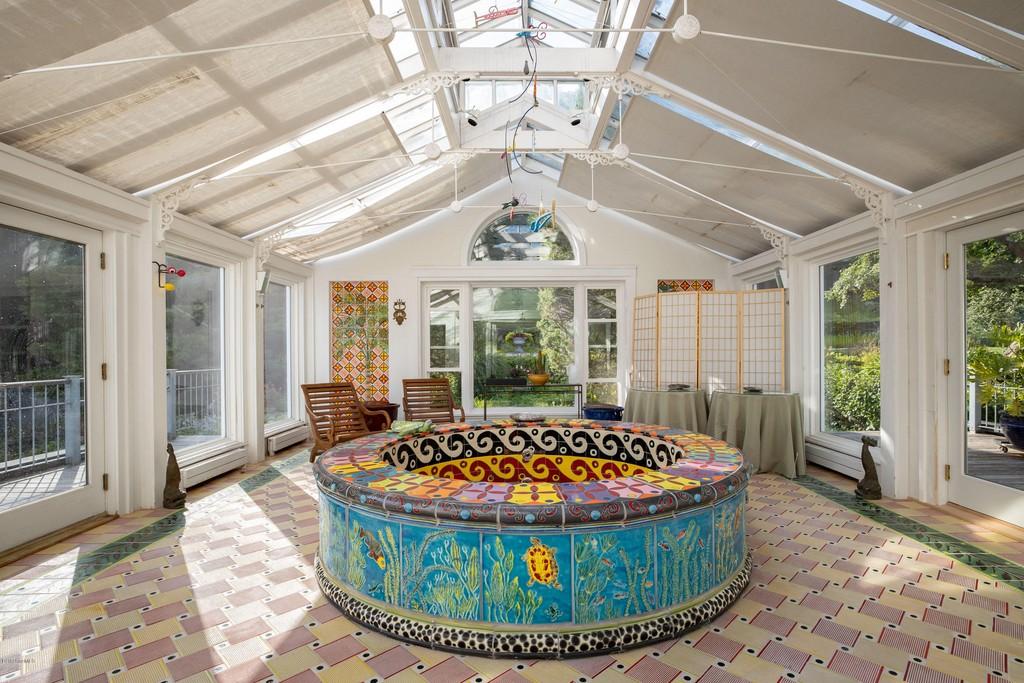 In Lenox, the original house was built in the 1830s, but has been added to throughout the years. It has six bedrooms and five-and-a-half baths. The first floor of the newer wing has a south-facing gallery that opens to a living room, music room, kitchen, and one of the solaria. Brick paths meander through formal gardens, leading to a converted barn/guest house and a pool/hot tub area. A 3800 MW solar installation is located on an adjacent field supplying most electricity. Listed at $3,400,000 by William Pitt Julia B Fee Sotheby's International Realty.