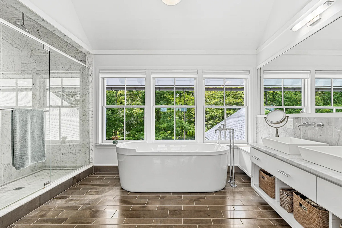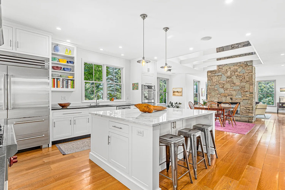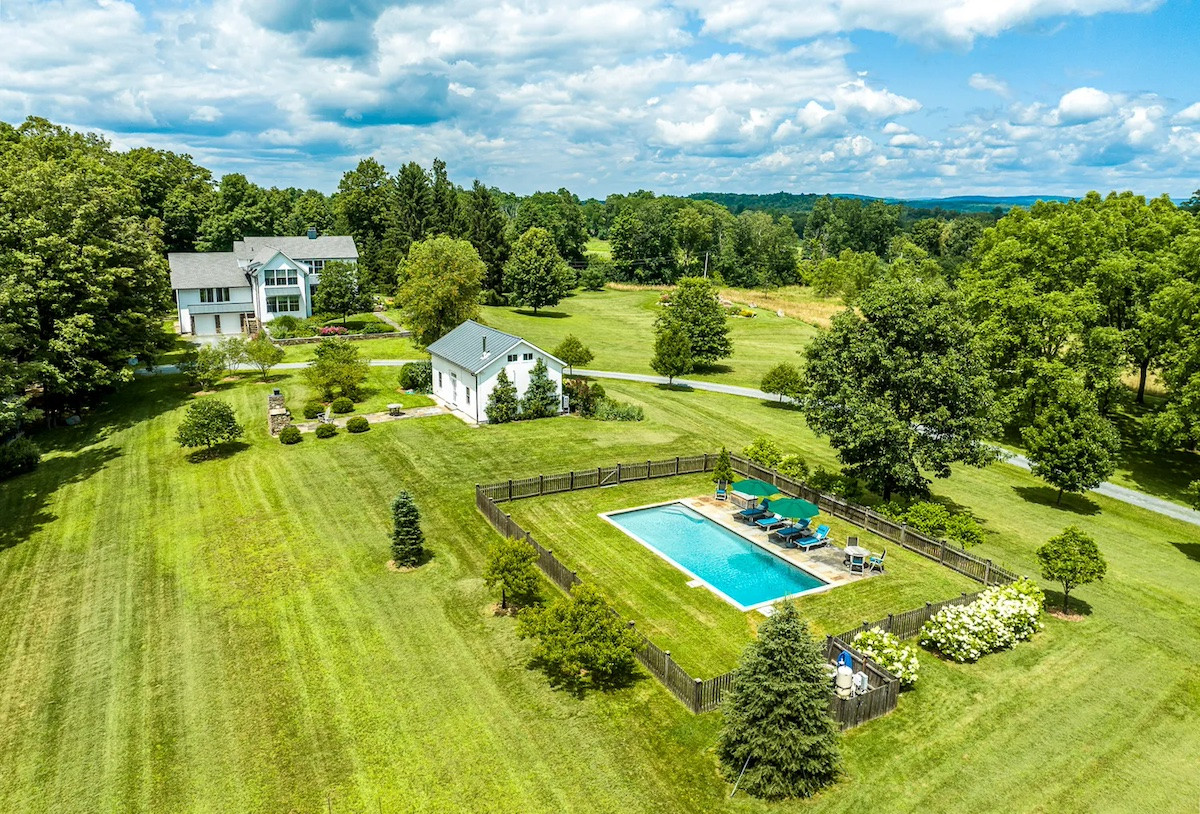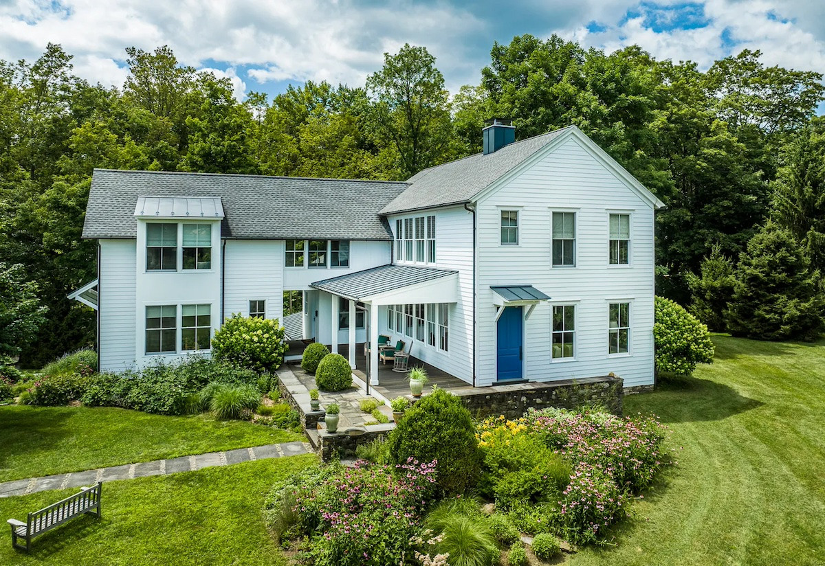 A modern home in Chatham sits on 13 acres offering mature flower gardens, fruit and flowering trees, fields, and a vast organic vegetable garden. The house has four bedrooms and four bathrooms, a state-of-the-art kitchen, and a bluestone fireplace. There's also a huge media room, two-story enclosed porch and a freestanding guest cottage. Listed at $2,695,000 by Corcoran Country Living.
