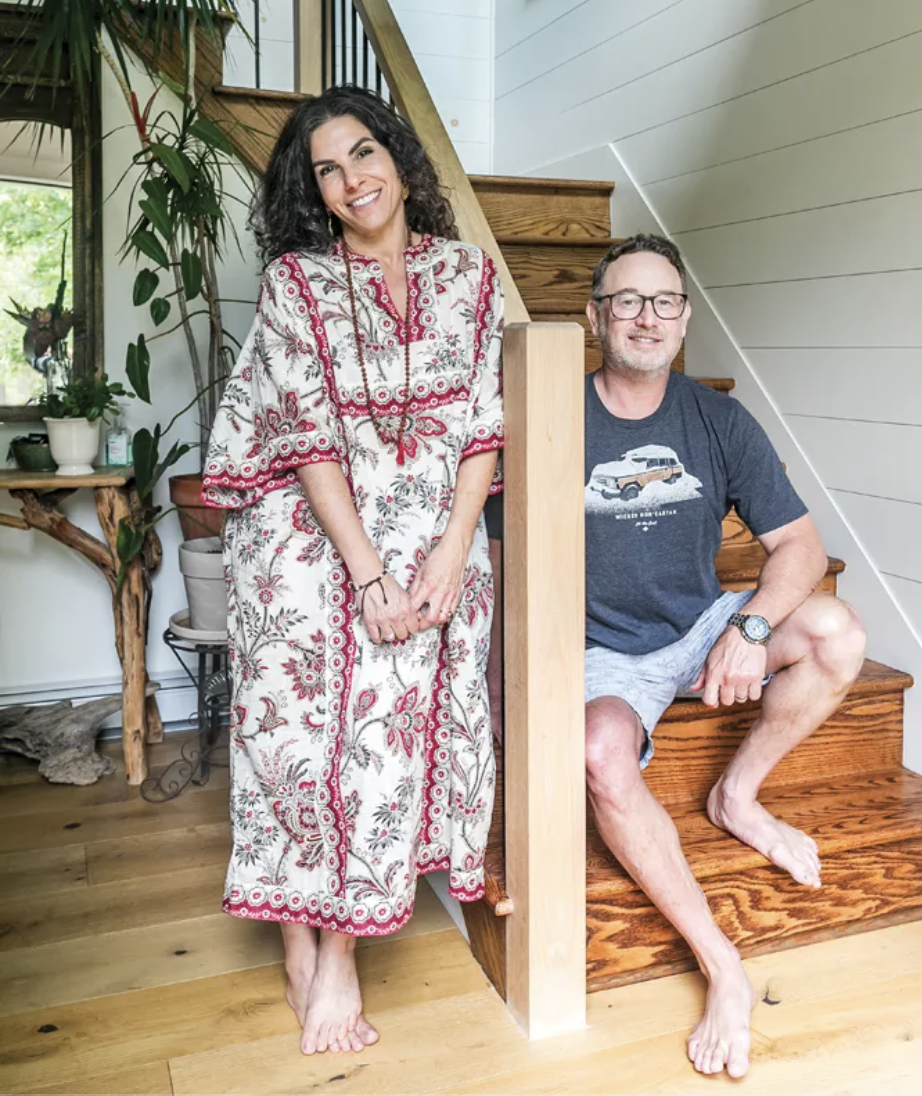 Janna and Josh sit on the center staircase. When renovating this staircase, Janna’s goal was to maximize natural light. “The design challenge of the center hallway, and the whole house, was like one of those puzzles where you move the squares around until it works,” she says. “When I did, I was so happy. Everything blended together and nothing sticks out like a sore thumb.”