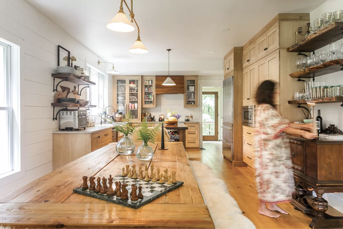 “The first thing we did was rip out the ceilings everywhere,” she says, adding nine inches to the ceiling height. To create an “old, renovated barn feeling” she added exposed beams and shiplap, then installed wide-plank white oak floors that could handle camp life’s indoor-outdoor demands.