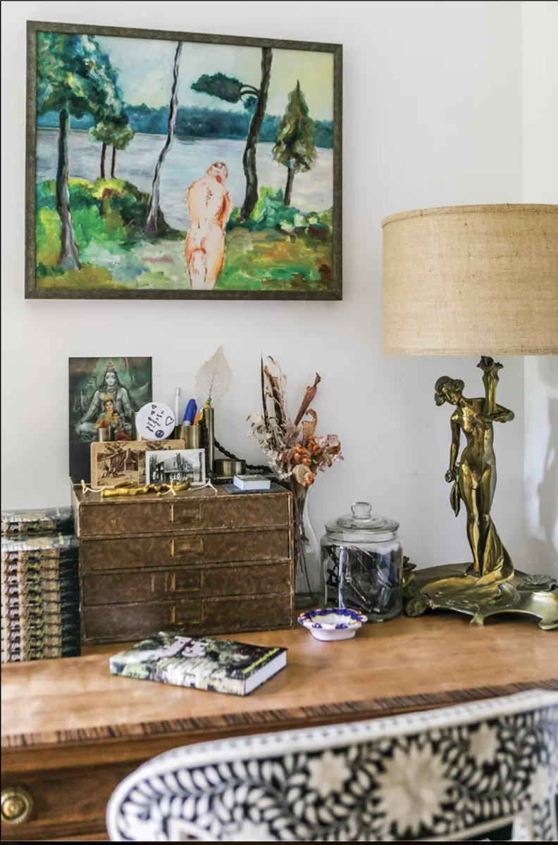 By adding glass doors to a corner of the first floor, the couple created a shared office space. Janna’s desk includes second-hand treasures as well as feathers, bones, and skulls she’s found in the woods. She renamed the thrift store oil painting Naked Girl after her first novel. The bronze figure lamp is from her grandparents.
