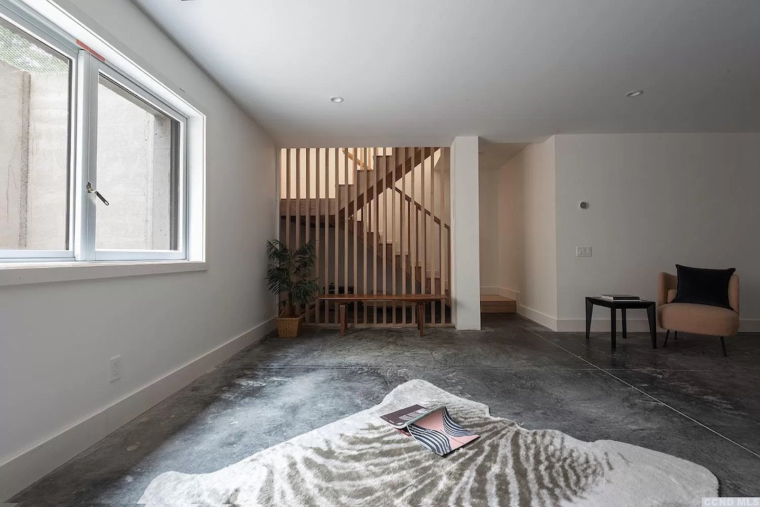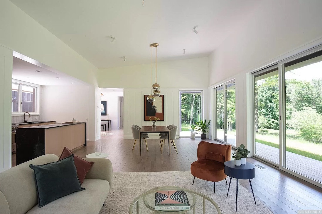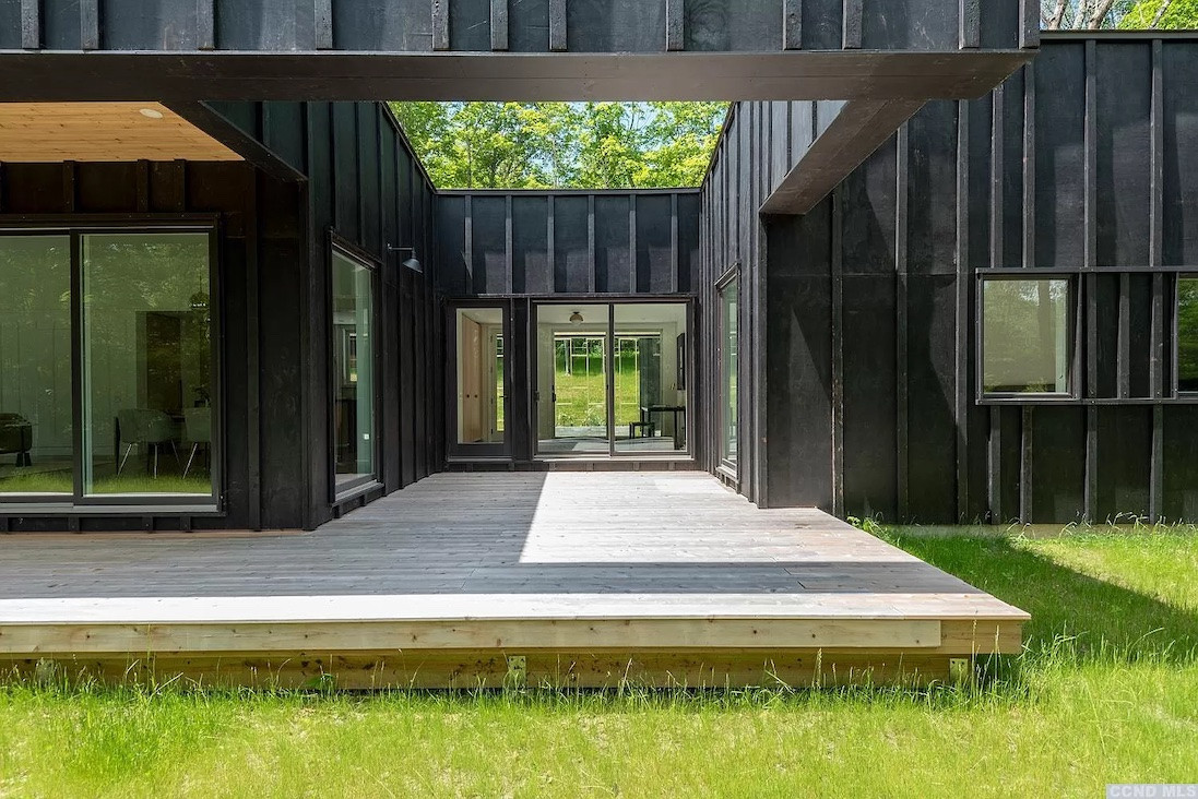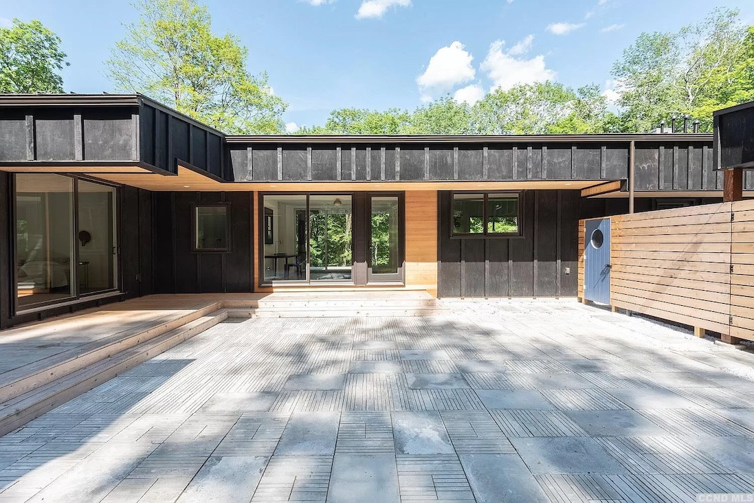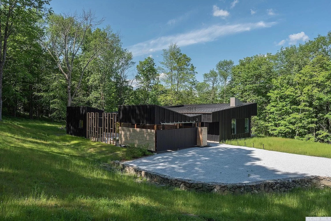 Enter this just-built house in Austerlitz through a courtyard with an entertaining space (both covered and open air). There are four bedrooms and four bathrooms, The kitchen features professional appliances. A secret door leads to a powder room and finished lower level for guests, a media room, study, or studio. The separate guest house is great for a WFH situation. A swim pond is included in the 12-acre property. Listed at $1,999,000 by Gabel Real Estate.