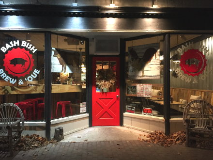 By Nichole Dupont Just a few short months ago, the only sign of life after dark in the center of Sheffield, Mass. was the light shining from the congregational church tower. But Berkshire native Jesse Watkins and his business partners Jim and Ana Olivieri changed all that when they opened Bash Bish Brew and ‘Que, a no frills — but still warm and welcoming — barbecue joint. The thick wooden bar is the centerpiece of the vintage-style eatery. Bright red chairs and stools lend an ironic pop to the space, which is often full, even on week nights. The simplicity should not fool you. The extensive beer selection — local Big Elm collection, Ballast Point Grapefruit Sculpin, Allagash White, Pabst, even Coors Light — is a perfect whistle wetter while you mull over the one-page, no-regrets menu. And what a menu; the stuff of roadhouse dreams. Starter plates include loaded fries (with pulled pork, mozzarella and house gravy, $11); homemade pretzels with beer cheese and horseradish mustard, $6; and a slew of wings with your pick of sauce including Carolina vinegar, habanero-maple or buffalo, $11.