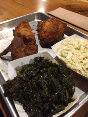 It goes on from there. Sandwiches — pulled pork or chicken, brisket — and burgers, including the Beetnik black bean, beet and quinoa patty ($14), are piled high and served with a healthy side of fries and coleslaw. Dinner platters, all served on aluminum trays, include thick brisket ($18), four-piece fried chicken ($25), St. Louis-style ribs ($16 for quarter rack), and the Pitmaster, a meat extravaganza of ribs, brisket, pulled pork and pulled chicken ($39). There is no pretense of Southern authenticity here. All of the meat is smoked in-house, using rubs and an alchemy that Watkins and his pit team developed through a series of trial and error, and then success. The meat is smoked to perfection. Maybe it’s the wood they use, which includes old whiskey staves from Berkshire Mountain Distillers and massive bundles of pear tree kindling that used to line Great Barrington’s main drag. Even the pulled chicken, which always runs the danger of being dry without some added sauce once it hits the plate, is juicy. Each meat has its own unique flavor, unaltered by an overabundance of sauce or so much doctoring it could be anything. The portions are generous. And the buttermilk batter is solid, not corn-flaky, yet it melts on the tongue and gives way to a tender, herby bite. Meats are the star of the show, they almost have to be, but less than halfway through the meal we realize that the sides are not obligatory ornaments. The crisp and colorful coleslaw is fresh. The golden cornbread — made with a recipe handed down from Watkins’ preschool teacher to his mother, then to him — is nearly as thick as cake, the outside crisp and buttery. The baked beans (made with black beans) are rich with molasses and little bits of bacon. In fact, rendered bacon becomes the base for many of the sides, including the not-to-be-dismissed collard greens.