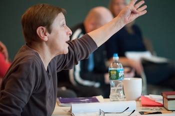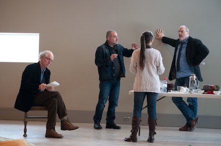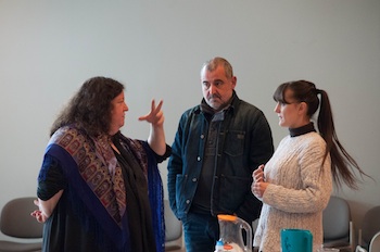 That part could seem dry on paper, but Dobchev knows what he wants—he has decades of experience delving into Chekhov’s words. He hurries over to the actors, suggesting that Wilson pantomime writing out the financial figures on a large blackboard, with exaggerated intensity. Dobchev, seen above between Mladenova to his left and translator JoJo Hrstova to his right, then goads Wilson raise the intensity for this portion, even banging his head against the wall as a demonstration. On a later run-through, the request for water is tossed off inconsequentially, setting up the much funnier bit to come. The Lenox-based company is receiving its own bracing jolt of cold water, in a way, in this cross-cultural collaboration with Sfumato, an experimental outfit based based in Sofia, Bulgaria. A series of exchanges beginning in 2010 have led up to this week-long visit; Varon previously took an acting workshop led by the Bulgarian artists, and later, returned with Wilson to lead those actors in a Shakespeare workshop. S&Co. artistic director Tony Simotes also visited Bulgaria and took a tour of its theatre scene, including a production of The Winter’s Tale put up by Sfumato. At a technical level, the approach of the two companies is very different. The Sfumato technique is clearly coming from a European conception of the director as auteur, for instance, whereas S&Co. technique is grounded in the actors’ personal connection to the text. This immersion in Sfumato’s rehearsal methods, in which 18 S&Co. members participated for a week in March, is strictly a behind-the-scenes affair. But its impact may linger. Earlier, over sandwiches, Varon (who has directed many well-received productions at S&Co., including Martha Mitchell Calling, Much Ado About Nothing and Sea Marks) recalls her first Bulgarian visit, sponsored by the Drama League.