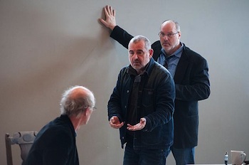Walton Wilson has been cradling his head in his hands for about a half hour now, his face completely hidden from view. The character he’s portraying in an informal performance of Anton Chekhov’s Uncle Vanya is feeling cut off from his surroundings. A few feet away in the spacious rehearsal studio, Kevin Coleman runs through multiple attempts at a short speech, inching through it line by line between frequent interruptions. Ivan Dobchev and Margarita Mladenova, founders of Bulgaria’s Sfumato Theater Laboratory, sit behind a fold-out table and break into Coleman’s performance, speaking to the actor (who happens to be a Shakespeare & Company co-founder, and the head of its education program) through a valiant translator. (Dobchev and Mladenova find common ground with actor Daniela Varon in the neutral language of French, which they use to sort out logistical details throughout the day.) Although the actors are working from an English-language translation of the Russian playwright, the two visitors know the play so well that it doesn’t seem to make a difference. Finally it’s time for Wilson’s first line. His character is frustrated, increasingly agitated, and asks haltingly for a glass of water. Obligingly, Varon hands him a bottle of water and a plastic cup. Disregarding the cup, he shoots up out of his chair and pours the water over his head, shaking his torso and sending beads of water flying. The Bulgarians intervene. They counsel Wilson not to go too big too soon. They want to place the emphasis on an upcoming exchange, when Wilson’s character details his years of financial commitment to the family farm.