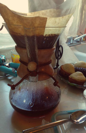 The basic recipe (makes one hearty cup of bulletproof coffee):1 cup of brewed black coffee, hot 1-2 tablespoons of unsalted, grass-fed pasture butter (it’s pretty essential that it’s unsalted and pasture — Kerrygold is a good one and easiest to find) 1-2 tablespoons of coconut oil — comes in a peanut-butter looking jar; the "oil" is solid. Don’t worry, the hot coffee and the blender melt everything. Round one:We used Six Depot Ethiopia Amaro Gayo, coarsely (and freshly) ground to accommodate the Chemex brew method. While you don’t need a Chemex to make bulletproof coffee, you should probably have one for your general happiness. For the fats we used Organic Valley unsalted pasture butter and LouAna coconut oil. Since there were five of us, we brewed about two and a half cups of coffee and added almost three tablespoons each of butter and oil. We used a little personal blender to mix it all together. Even this seasoned gal was delighted by the frothy outcome of the blender (I’ve been using a little whisk this whole time at home). The results of this run-through were pretty delightful, even to the skeptics in the bunch (Amy was getting itchy, even hostile for caffeine; Paul cleared his throat impatiently). We ended up with a buttery latte that needed no sweetener (although you can add sugar, coconut milk, cinnamon, honey) or any modification at all really. “This is really like velvet," Paul said. “I can’t get over how creamy it is." “It’s like dessert," Regina piped in. Noting the tiny oil bubbles at the top of the coffee once the foam had settled, we all agreed that it wouldn’t stop us from finishing the cup. Not in the least.