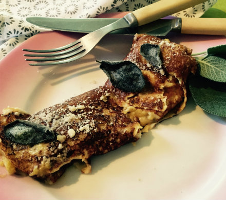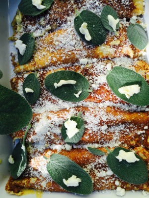 Butternut Squash CannelloniMakes 12 cannelloni For the filling:4 tablespoons unsalted butter 1 tablespoon olive oil 1 onion, coarsely chopped 1 cup dry white vermouth 3 cups 2-inch-cubed butternut squash, steamed until soft 2 rounded tablespoons all-purpose flour 2 cups milk 1 teaspoon freshly grated nutmeg 1 teaspoon salt 1 teaspoon freshly ground white pepper ¼ cup grated Parmesan cheese 12 (or more) fresh sage leaves For the crȇpes:2 eggs 1¼ cups flour 3½ cups whole milk Unsalted butter for frying In a large, heavy-bottomed skillet, melt 1 tablespoon butter with olive oil over medium-high heat. Sauté the onion until translucent. Reduce heat and add vermouth and squash. Smash the squash with a potato masher or the back of a fork. Stir with a wooden spoon to combine with the other ingredients. Keep at a low simmer. Meanwhile, make a white sauce: In a medium non-reactive saucepan over medium heat, melt 2 tablespoons of butter. Add flour and cook for 3 minutes, stirring continuously with a wooden spoon. Add milk, nutmeg, salt and pepper. Stir continuously until the mixture is slightly thicker than buttermilk. Add to the squash mixture and stir to thoroughly combine. Remove from heat. Make the crȇpes. Beat the eggs in a large bowl. Alternately add flour and milk, mixing continuously with a fork or a whisk (you’ll run out of flour before milk). Keep mixing until the batter is completely smooth and relatively thin – about the consistency of buttermilk. Melt 1 teaspoon butter in a 9-inch omelet pan. Pour a scant ¼ cup batter into the center of the pan and tip it from side to side to let the batter cover the bottom, not the sides, in a thin layer. Cook for 1½ minutes, or until the edge begins to curl and pull away from the side of the pan. Add another teaspoon butter to the pan every other batch. Place the crȇpes on a platter. Heat the oven to 350˚ F. Assemble the cannelloni: Line up the crȇpes – three at a time – and place about 5 tablespoons of squash filling down the center of each one. Roll them up as tightly as possible, leaving the ends open. Place each one in a large baking dish. Repeat until all the crȇpes are filled. Sprinkle the Parmesan cheese over the top. Arrange the sage leaves over the top, making sure each cannelloni gets at least one leaf. Dot the leaves with the remaining butter. Cover with tin foil. Bake for 15 minutes. Remove the foil and bake for another 15 minutes. The cheese should be melted and the sides bubbling. Serve immediately.