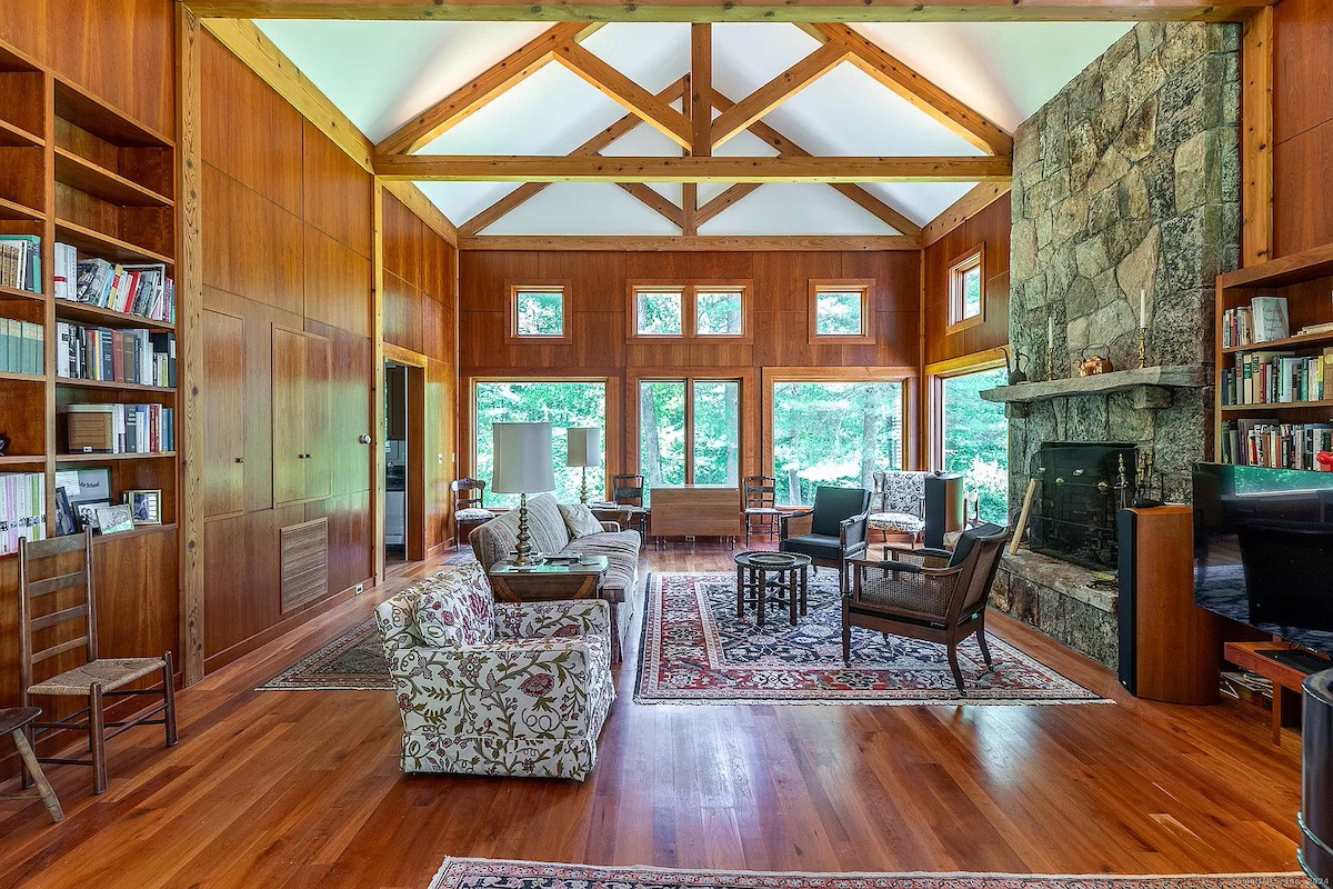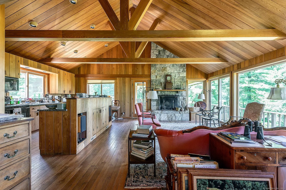 The main house on this West Cornwall property offers three bedrooms and three bathrooms, an open floor plan and a wraparound deck, plus mountain views. The finished lower level has a den with a fireplace. A two-bedroom, two-bathroom guest house also has a great room and fireplace. The property is sited on two separate parcels on both sides of a quiet road. Listed at $1,295,000 by Klemm Real Estate.