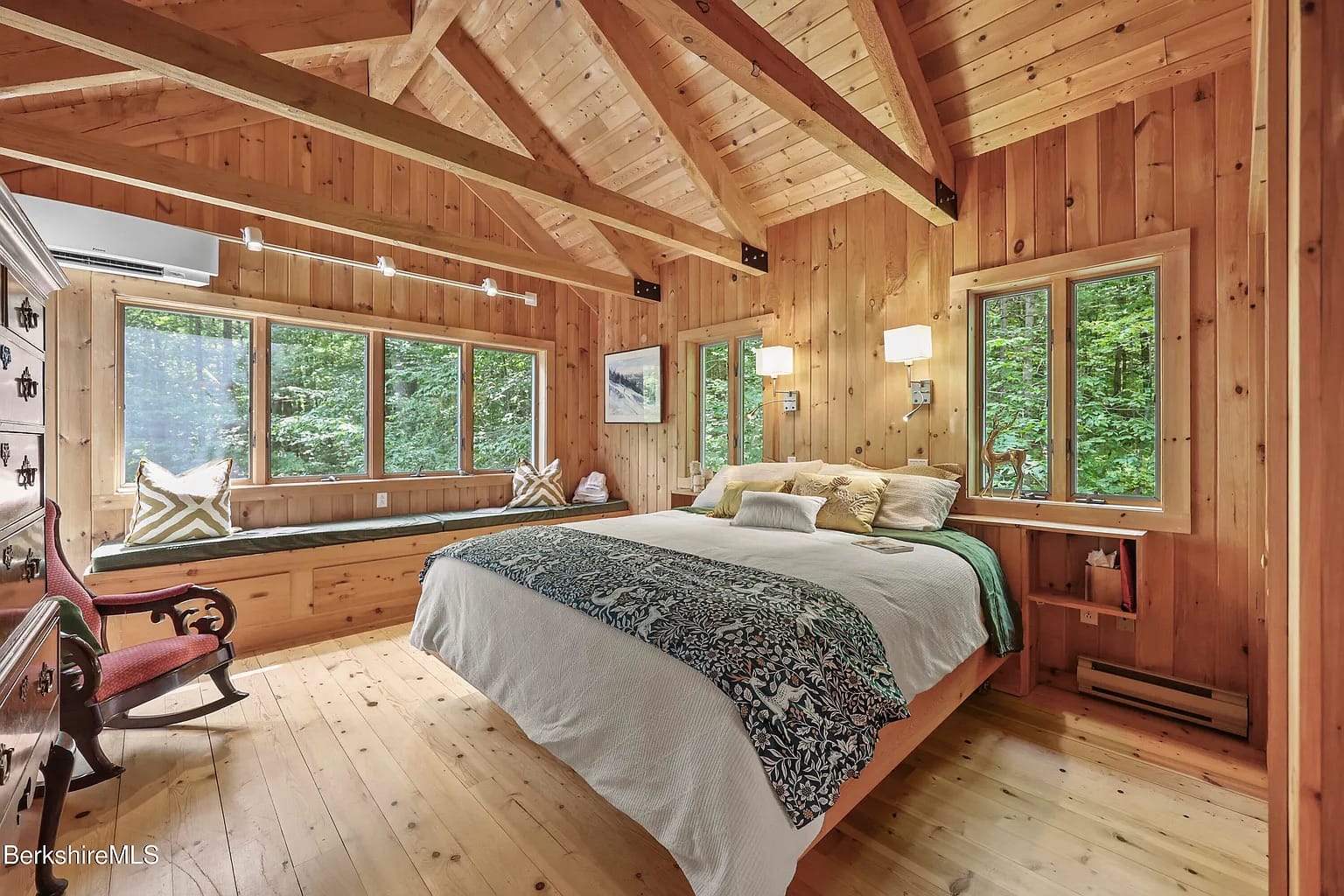 The 2,523-square-foot, four-bedroom, two-and-a-half-bathroom home opens into a dramatic great room with 25-foot ceilings, exposed beams, a stone-clad wood stove, and walls of glass and skylights. An updated kitchen with granite counters and GE Café and Bosch appliances anchors the room. Of course, there are big floor-to-ceiling windows to let in natural light and watch the snow fall. Knotty pine paneling gives everything, and I mean everything, a warm glow.