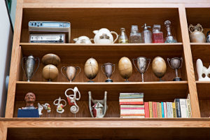 In a storage area of a science building, a student found something very close to Mark Dion’s personal history: a series of board-game-like psychological tests from the 60s, pictorial challenges in which a person must “correctly" complete a visual story with images on cards. To the modern eye, these tests are clearly biased and questionable, but in their day, they were gospel. When Dion was a child, experts made him submit to these tests and a battery of others. Doctors were trying to figure out what was “wrong" with him. Turns out, he was – and is – dyslexic. He is more image-oriented than writing-oriented. The tests – all but one in Universal Gathering solved “correctly" – are housed in the cabinet near some antique official Vassar crockery and cutlery. “The tests say something about the history of psychology and the history of education," says Lombino. “Mark says he’s getting a little bit of revenge on them now."