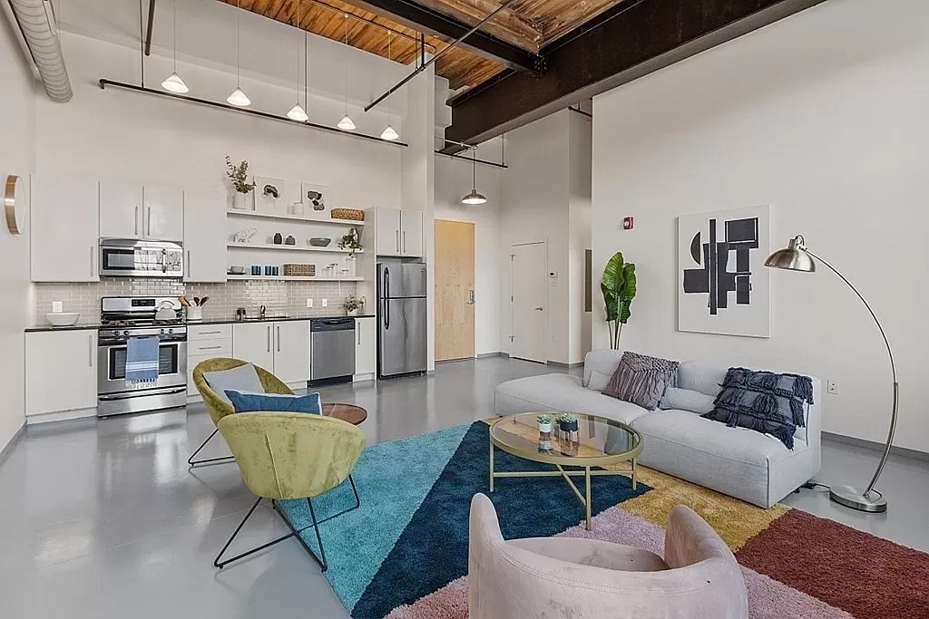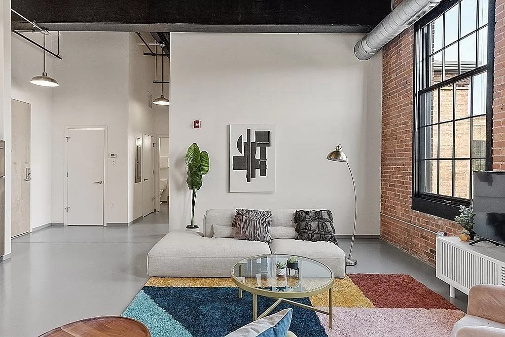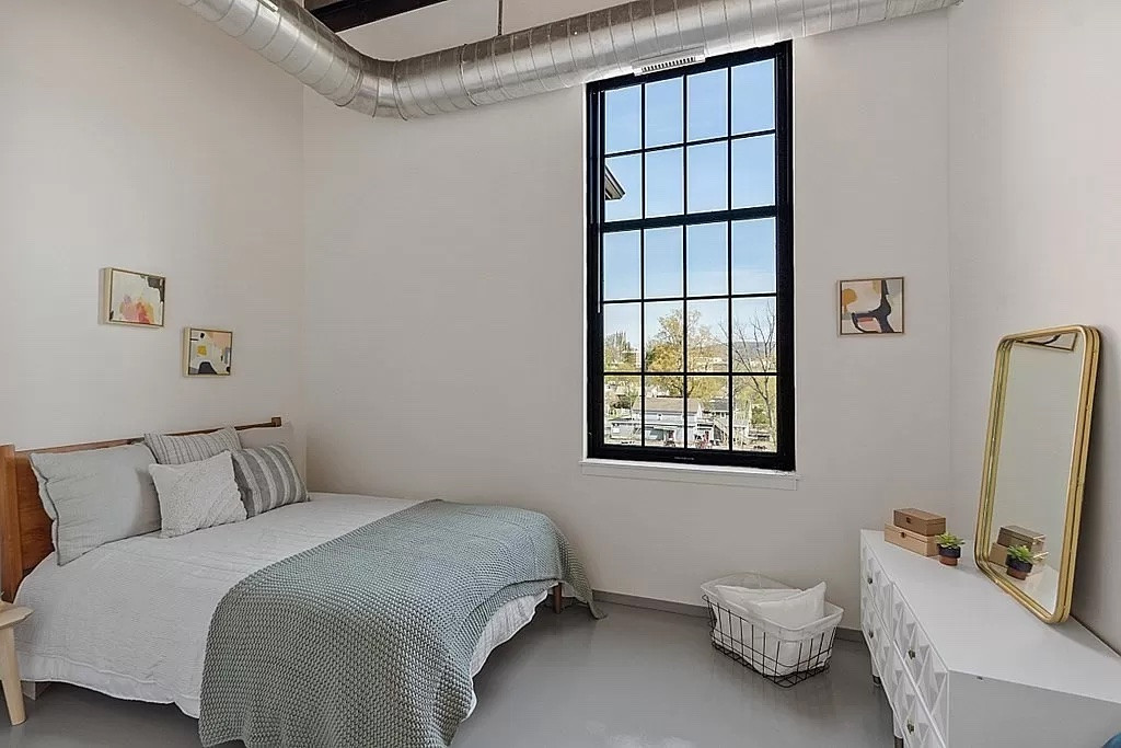 Located inside a former industrial mill building in Williamstown, this condo unit has one bedroom and one bathroom in 736 square feet. It features 12-16-foot ceilings, massive windows, and exposed brick and beams thorughout. Outdoor spaces include the "outdoor living room" with a fire pit, grills, and seating along the river walk. The main building offers a community lounge, fitness center and more. Listed at $550,000 by Streamline Communities.