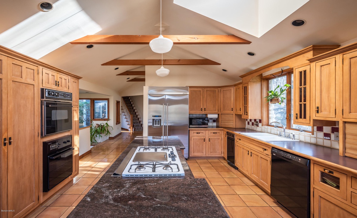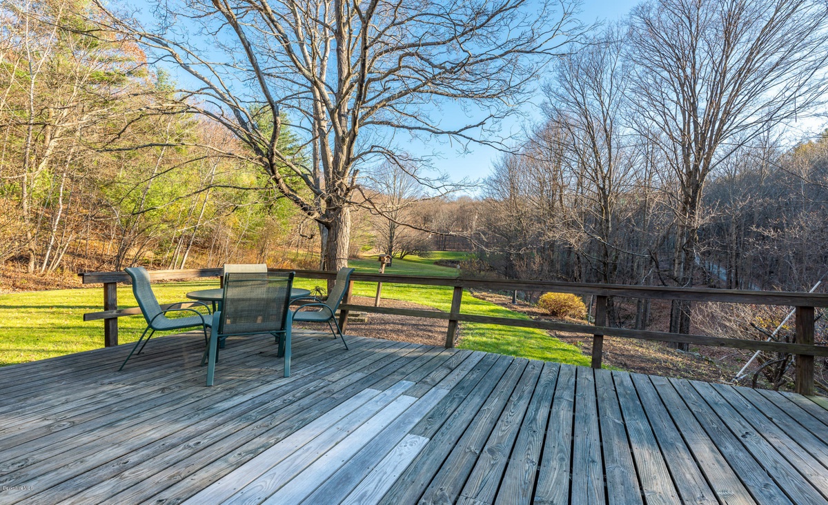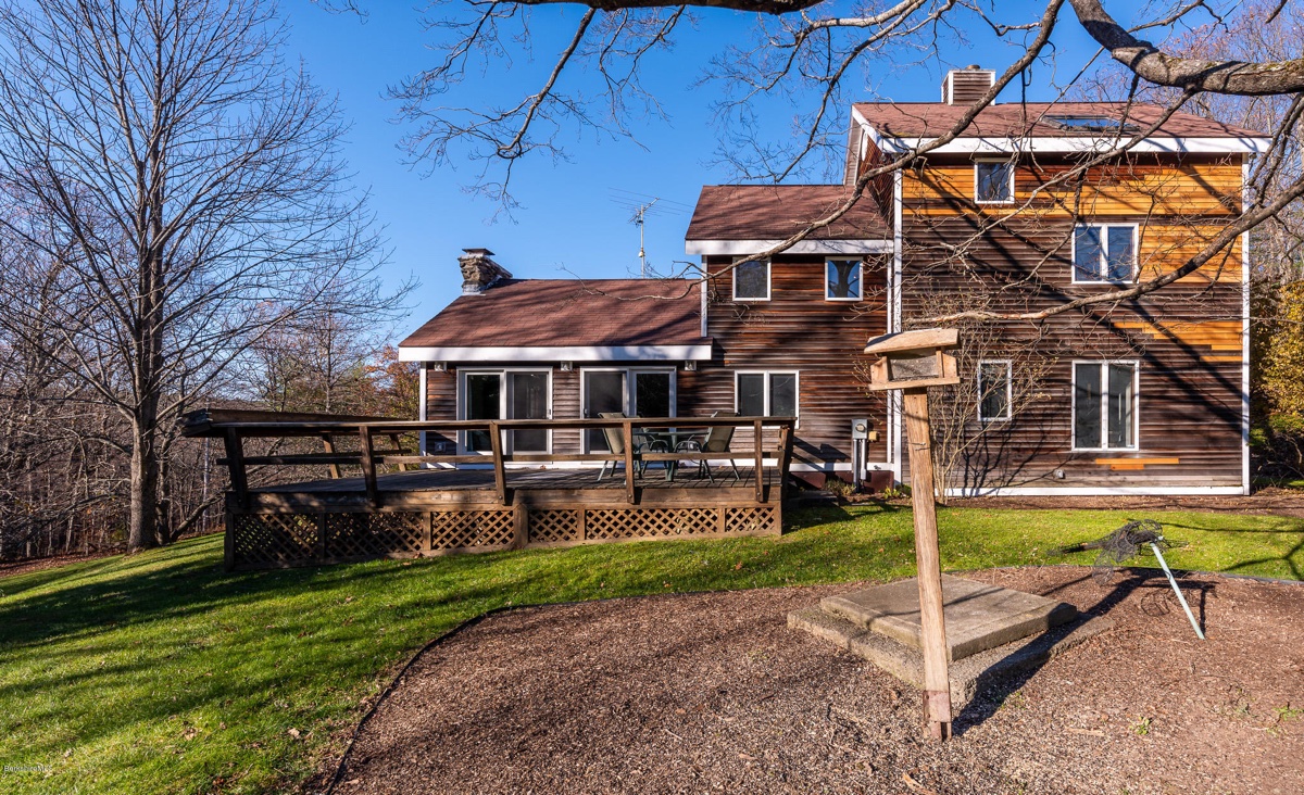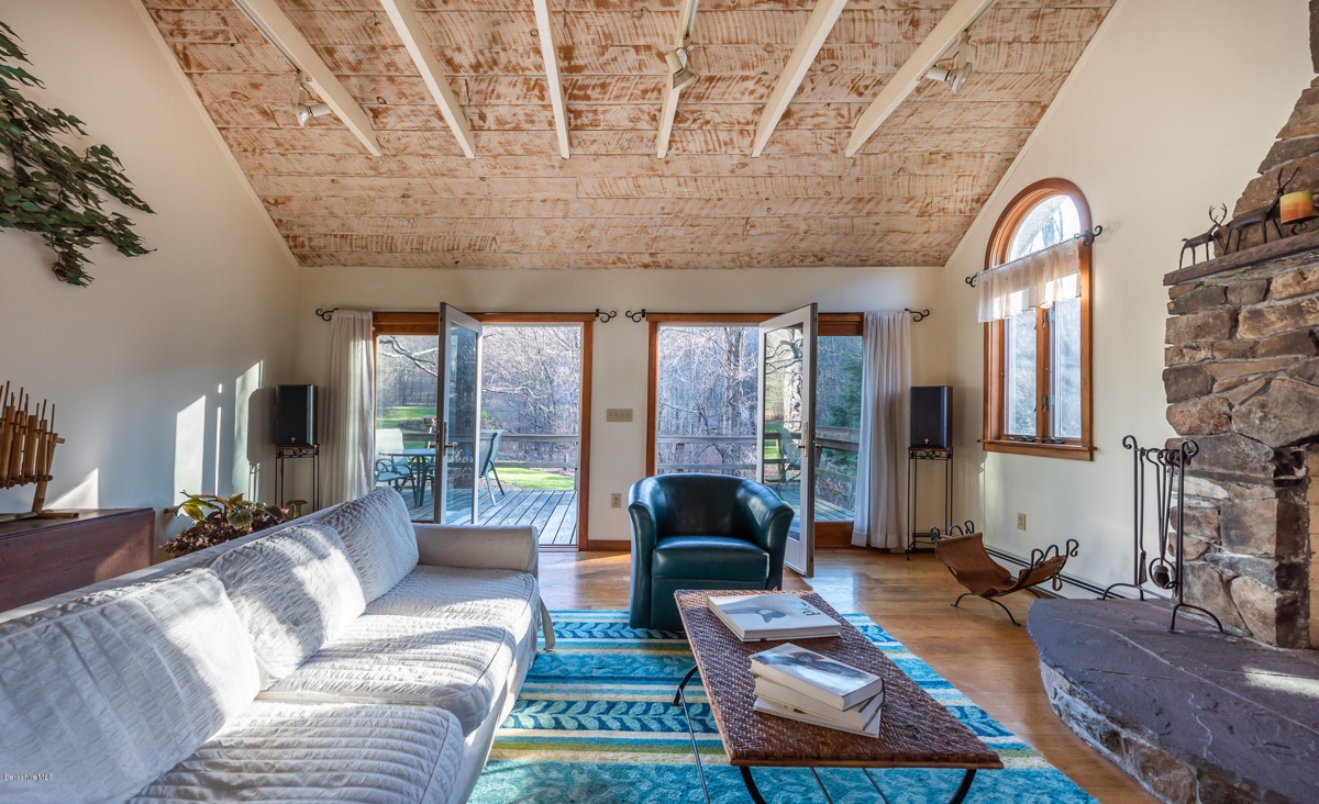 Located in Canaan on 120 acres, this contemporary home greets visitors with a charming front door. The more than 2,300 square feet includes 4 bedrooms and two-and-a half bathrooms. a stone fireplace in the living room and a wood stove in the spacious kitchen. A gazebo overlooks the pond on the property. Listed at $699,000 by Stone House Properties.