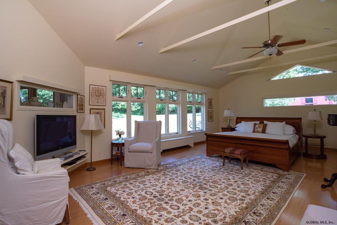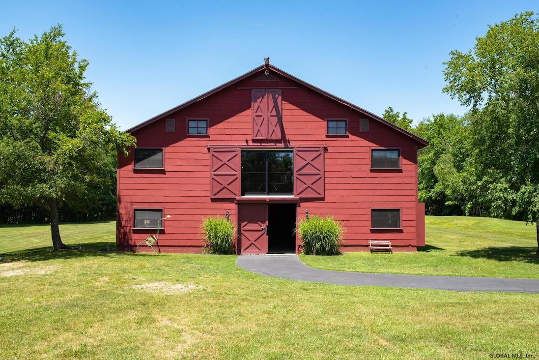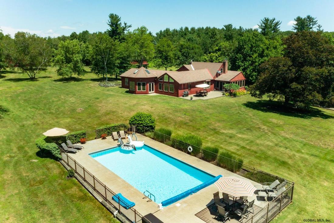 With views of the Taconic Mountains, a large Cape in Ancram offers four bedrooms and four bathrooms, a formal dining room, enclosed porch and patio. The landscaped grounds lead to the pool, and maintained trails lead to the four-acre swimming pond. The property also includes a gazebo and a three-story barn for guests. Listed at $1,850,000 by Berkshire Hathaway Blake.