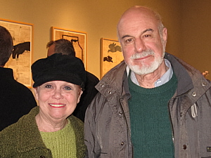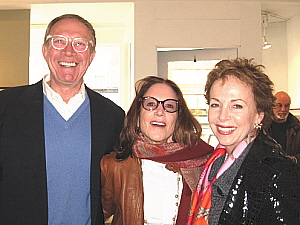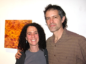 Phil Forman, Paula Forman, and Jane Ehrlich; artist Allyson Levy standing next to a piece of her exhibited work, and Scott Serrano, who has also shown at Carrie Haddad.