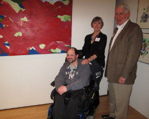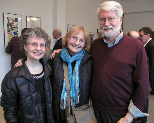 Artist Katrina Couture, Diane Firtell and faculty artist Stefanie Weber; Pat and Dennis Hogan with artist Myles Tosk in front of his work.