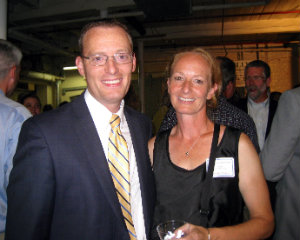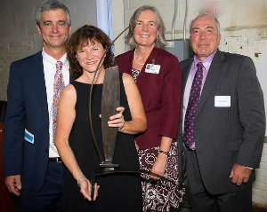 Lisa Green reports from Dalton. Curious to explore the in-progress Stationery Factory and eager to be representative boosters for the Berkshires economy, more than 250 people gathered for the 5th annual Berkshire Trendsetter Awards Ceremony on Thursday, September 10. Presented by 1Berkshire, the event honored seven individuals and businesses with Berkshire Trendsetter Awards to showcase their achievements and ongoing commitment to strengthen the Berkshire economy. Prior to the presentation, guests enjoyed drinks and hors d’oeuvres provided by Dalton purveyors. Closing out the evening, Hotel on North was honored with the Putting the Berkshires On the Map designation for the substantial contribution it is making to the overall image of the Berkshires. Above, hotel owners David and Laurie Tierney accept the award from Ruth Blodgett of Berkshire Health Systems — the 2014 honoree — and Don Dubendorf, 1Berkshire Chair. Photo by Christopher Duggan.
