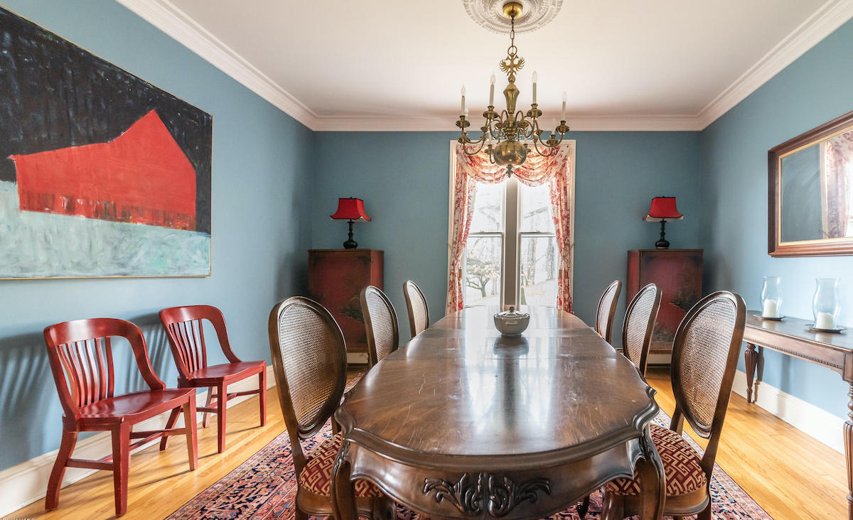 Set on over 44 acres, this center-hall Colonial has distinct characteristics of 1900, the year it was built. A rocking-chair-worthy front porch allows sweeping views of New Lebanon. Inside are wood floors, a living room with wood-burning fireplace, a large dining room, four bedrooms, and four-and-a-half bathrooms. A pool is perched high on the hill, with a pool house near the tennis court and two ponds. Listed for $595,000 by Stone House Properties.