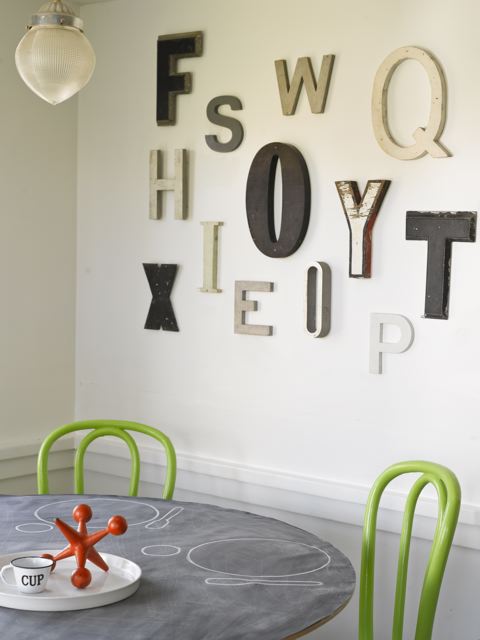 A raised platform in the kitchen left over from the original house is now the family's sunny breakfast nook. "I love the graphic quality of old signs, numbers and letters and have them throughout the house. I also have a weakness for chairs—the green Thonet chairs in the kitchen are the first I ever owned. I bought them when I was 15 and have been painting them different colors ever since. They now look great with the Saarinen table base, which presently which presently has a chalkboard oilcloth top."