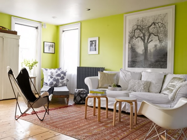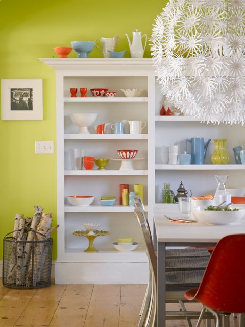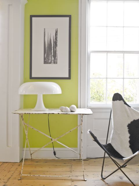 "I wanted something different, more graphic," Raina says. She started by painting the combined living-and-dining-room walls a brave shade of green. To find the ideal color, she and Robert bought five or six sample pots, brushing each color onto its own sheet of Masonite, then moving the patches around the room, to see how each looked in various lights. Finally, they settled on Benjamin Moore's Grape Green (#2027).