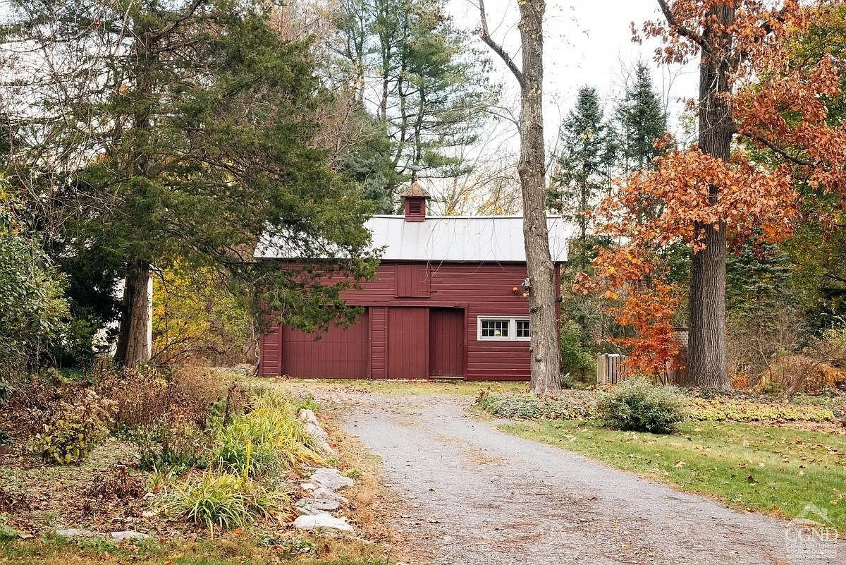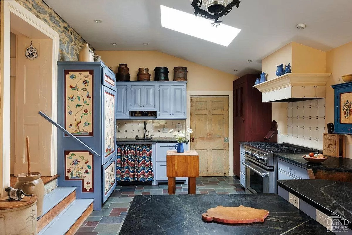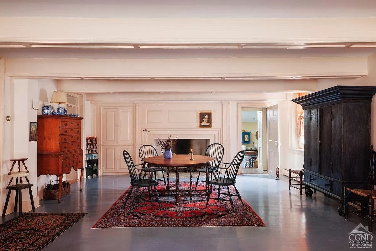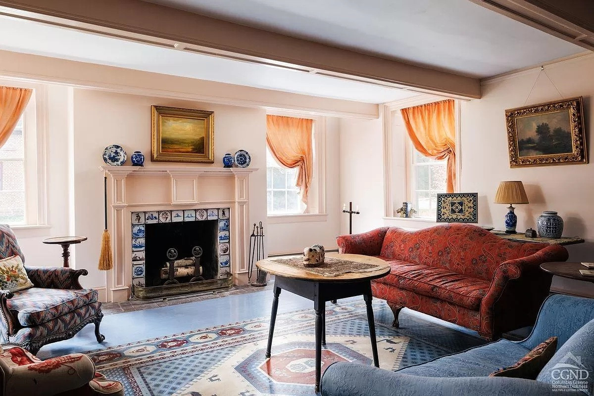 Circa 1754, the Charbonneau House in Kinderhook is crafted of stone and brick and has four bedrooms and two bathrooms. It offers a beamed center great room, a major hearth, several wood-burning fireplaces, and an audio video/sitting room. A modern addition holds a baker's kitchen and screened porch. A vintage barn sits outside and has room for a studio. Listed at $1,200,000 by Four Seasons Sotheby's International Realty.