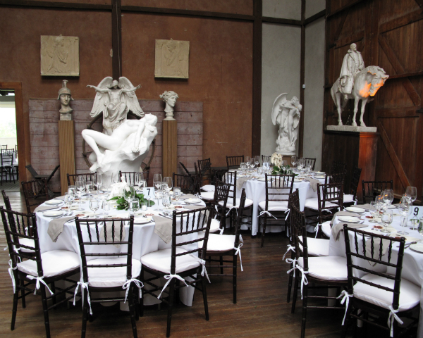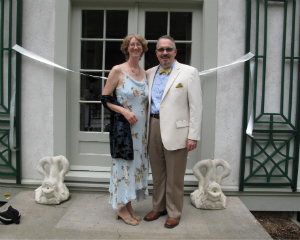 Amy Krzanik reports from Stockbridge. It doesn't take much convincing when you're invited to enjoy a cocktail on the piazza of Daniel Chester French's studio, overlooking the lush gardens of his former summer estate. As Chesterwood celebrated the reopening of French’s refurbished studio at a gala on Friday, May 23, guests jovially enjoyed the views while bidding on silent auction items that included three framed photographs shot at Chesterwood by Annie Leibovitz for her book Pilgrimage. The studio, closed since 2012, has undergone a painstakingly historically accurate renovation, with special detail paid to its facade. Berkshire Pulse dancers, dressed in all white, performed a piece inspired by their research on Daniel Chester French's only child, Margaret French Cresson, also a sculptor, who ceded Chesterwood and its collections to the National Trust for Historic Preservation. Dinner was held in French’s studio and Michael Ballon of Castle Street Café prepared the evening’s menu using dinner notes from Mrs. Mary French as a guide. The menu included Taft Farms asparagus aspic, tournedos of beef with Madeira sauce, and mixed berry trifle with crème anglaise and raspberry sauce. Read the related RI article about the restoration project: The Rock Star of Stockbridge: Daniel Chester French. Above, sculptors Laura and Rick Brown with the Executive Director at Massachusetts Cultural Council, Anita Walker, and Chesterwood Director Donna Hassler.