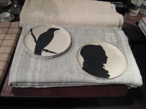 Set of 4 Gothic dessert plates in melamine, $32; gray Swan Island blanket, $575 at Rural Residence, 316 Warren Street, Hudson; 518.822.1061; two large lumps of Pennsylvania coal, polished and turned into bookends by Jim Zivic, at Foley & Cox, 317 Warren Street, Hudson; 518.828.3210