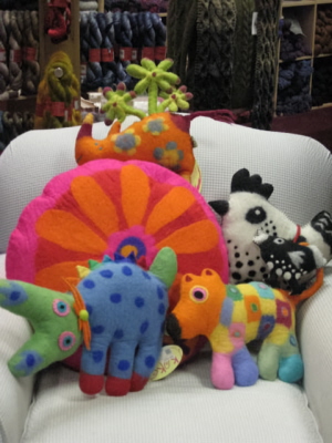 Whimsical, hand-felted cushion and creatures, $16 - $72 at Twin Hearts Handworks, 137 North Street, Pittsfield; 413.499.0021; "Nell" dress, $59 at deMarchin's Cote Famille, 621 Warren Street, Hudson; 518.828.1391