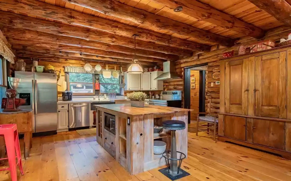 Sited on 1.35 wooded acres in Great Barrington, a log cabin built in 1986 has two bedrooms and two bathrooms, an open living plan and screened and open porches. The kitchen offers marble counters and a soapstone farm sink. The finished basement offers an additional 625 sqaure feet of space and game room. There is an updated high-efficiency boiler. Listed at $499,000 by Alden Country Real Estate Services.