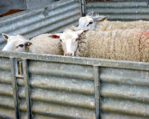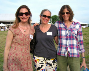 Amy Barr, Julie Fenster and Jami Rubin; sheep peeking out of the pen before their turn at the sheep-shearing demonstration.